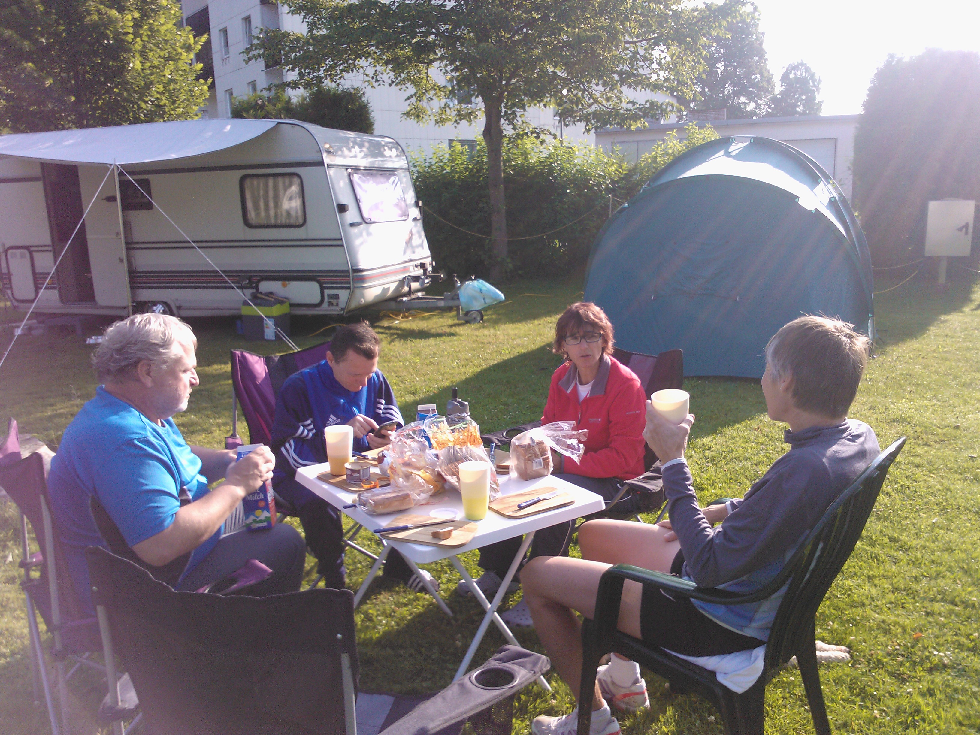 Angereist sind wir am Vortag des Rennens: 2 Männer: Hannes Prem, Chef d’Equipe, Christian Bair, 3 Frauen: Angelika Winkler, Kathrin Sojer und ich, 2 Hunde: Sportskanone und Zwack, ein Kombi und ein Camper. Zwar hatte der Veranstalter eine Wiese direkt im Start- und Zielbereich für Camper zu Verfügung gestellt, aber weil wir uns für Wasser und Strom entschieden, übernachteten wir auf einem nahegelegenen Campingplatz. Das Wetter war herrlich und so erfreuten wir uns eines herrlichen Frühstücks in der Sonne 🙂