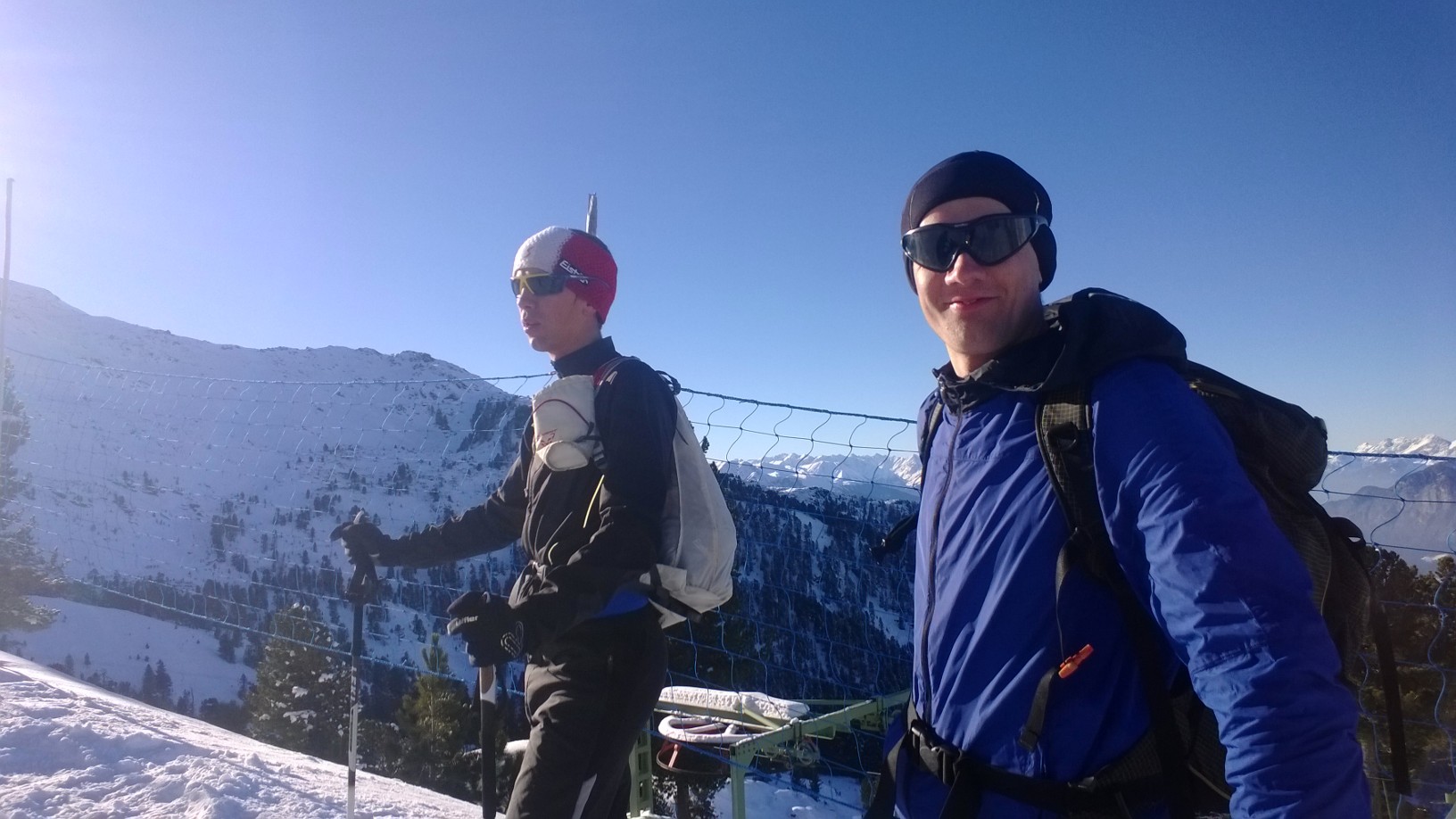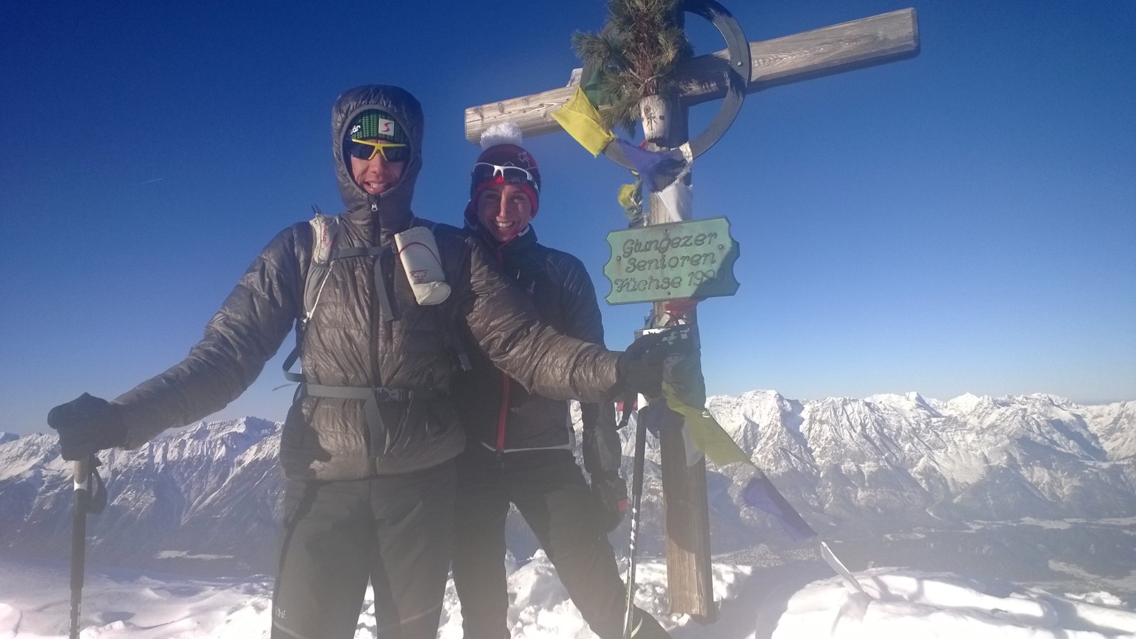 Und zum Abschluss des Wochenendes hieß es heute: Endlich Skitour! Schön vorsichtig! Schon bei der Talstation treffen wir Marcell mit Sohnemann auf der Rodel. Der hats fein: wird gezogen 🙂 Wir gehen 400 m, da will uns einer rechts überholen: Er meint, er müsse wissen, welche Frau da vor ihm geht. Es war Josef. Wir freuen uns und verbringen die kommenden 1700 Hm zu dritt: Wolfi, Josef und i und wir hamm recht a Hetz. A ja, bevor i s vergess, beim Runterfahren treffen wir Marcell noch einmal: mit Tourenski. Gott sei Dank habe ich ihn abends nicht auch noch am Christkindlmarkt getroffen, denn dann wäre die Kiste Bier fällig gewesen.