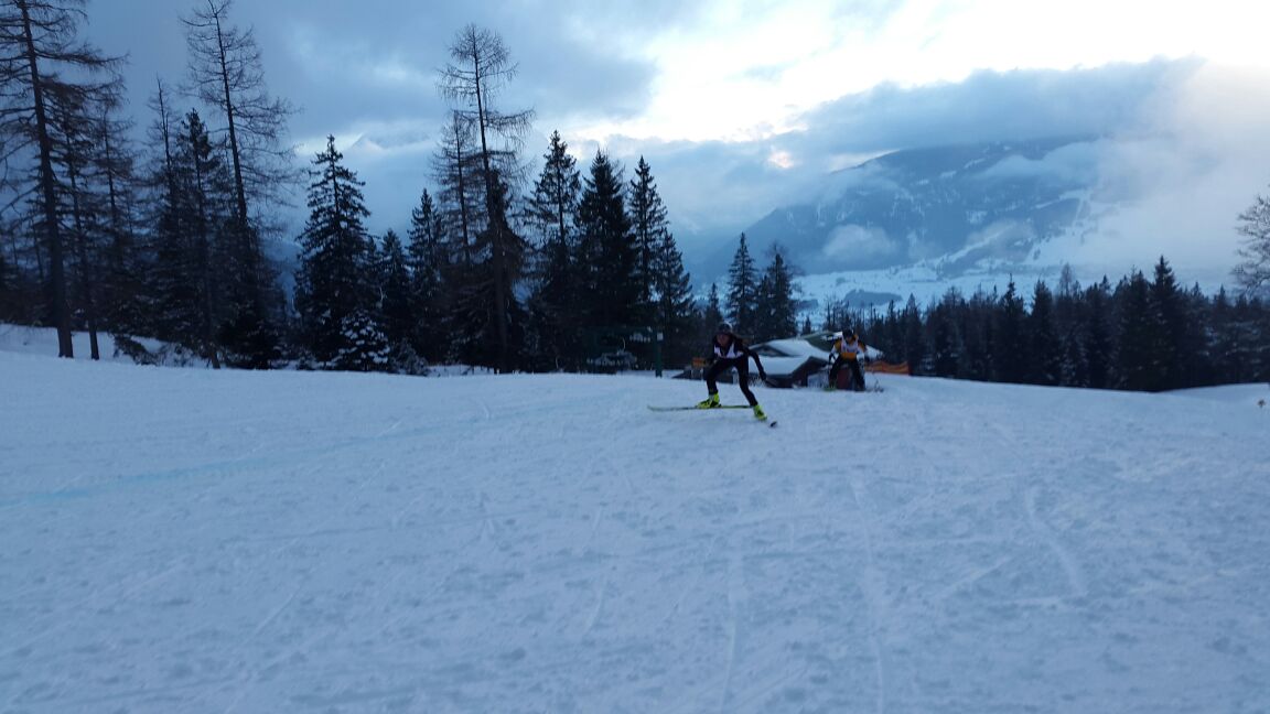 Der Start erfolgt in Ehrwald auf 1000 m. Mit den Schiern in den Händen laufen wir ca. 250 m bis zum Sunracer (Talstation Sessellift). Als vierte des Gesamtfeldes werfe ich meine Schi in den Schnee. Ich habe große Schwierigkeiten beim Einsteigen in die Bindung und verliere Zeit … bleibe aber ruhig. Als so ziemlich Letzte laufe ich endlich los. Ein Zuschauer spricht mir Mut zu „Jetzt aber! Hop!“ Ich laufe los und mache einige Plätze rasch wieder gut. Erst flach und nur im mittleren Teil etwas steiler geht es hinauf zur Bergstation der Wettersteinbahn auf ca. 1500 m.