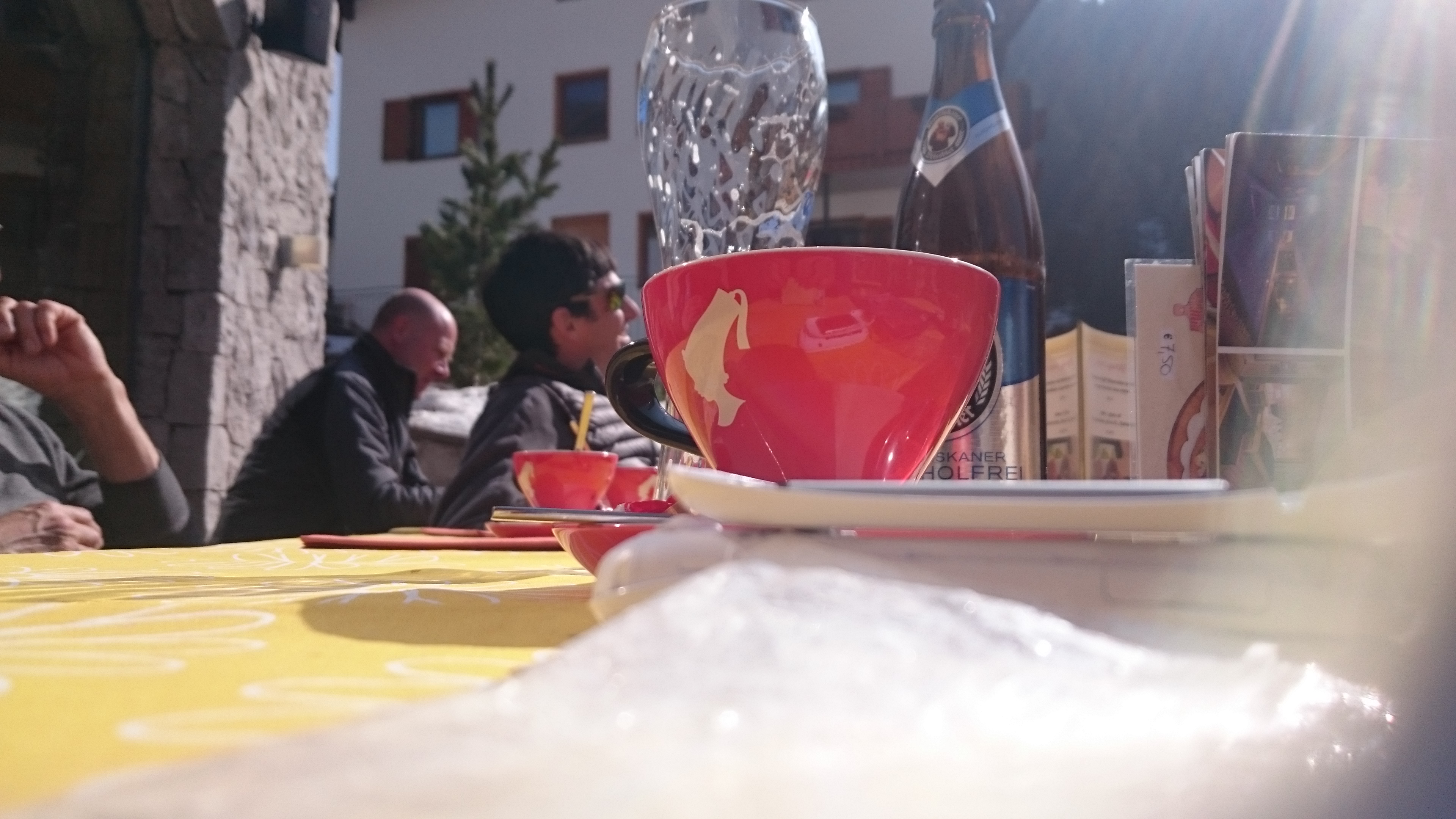 Über den Passo Campolongo geht es nach Arabba. Beim Auffellen dort klebt mein Fell nicht mehr. Ich werde etwas unruhig, aber Armin meint bestimmt: „Weg, weg, weg!“ und ich nehme das zweite Fell, das auch für den vierten Anstieg dann noch wunderbar klebt. Über das Pardoi Joch geht es nach Canazei. Die Kommunikation zwischen Armin und mir verläuft 1a. Wir sind ein super Team und ich bin glücklich, mit ihm auf dieser Reise zu sein.